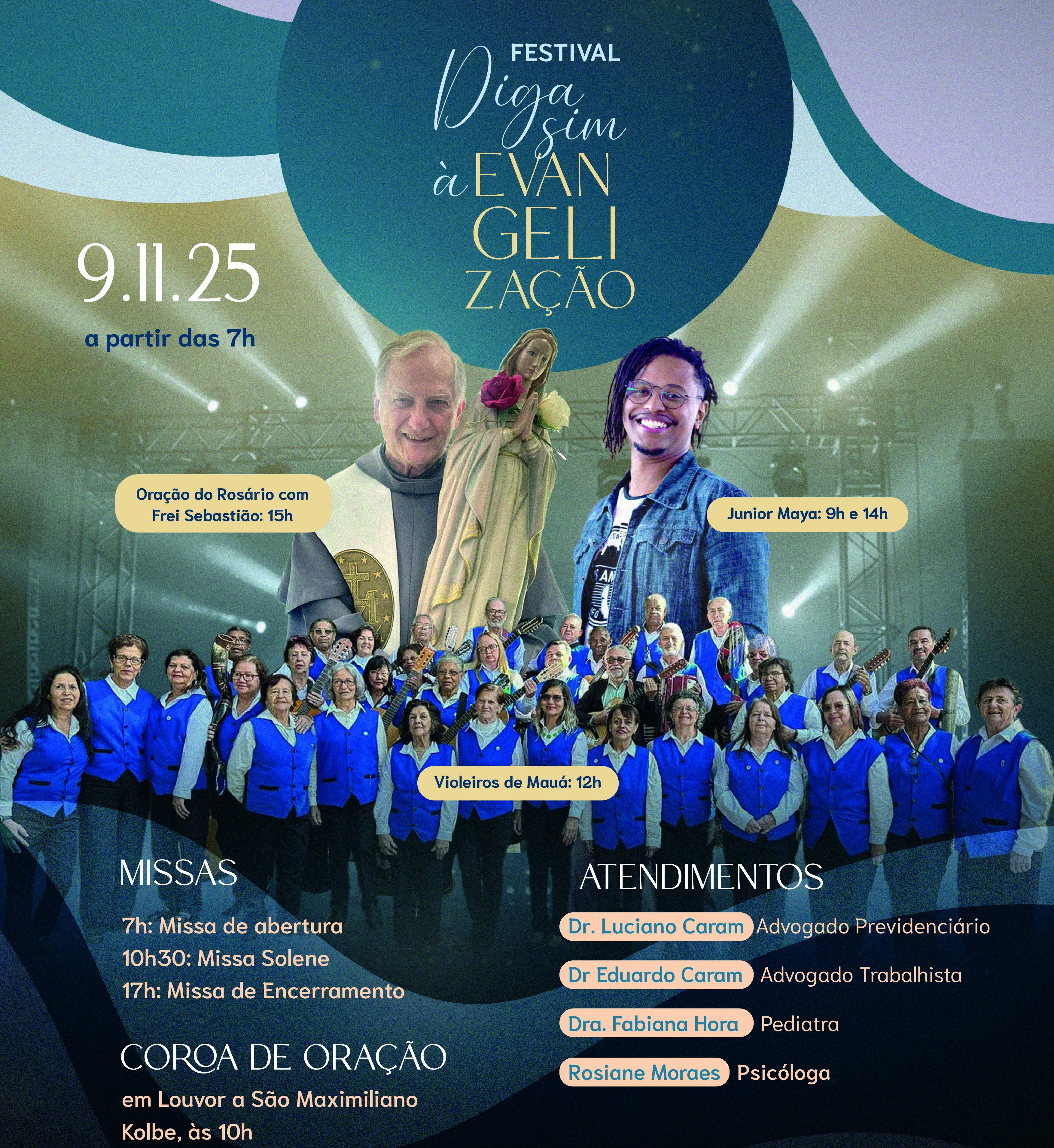 O Festival “Diga Sim à Evangelização” será realizado no dia 9 de novembro, domingo, com início às 7h com a celebração da Santa Missa. Às 10h30 será a missa solene de aniversário e às 17h haverá a missa de encerramento.