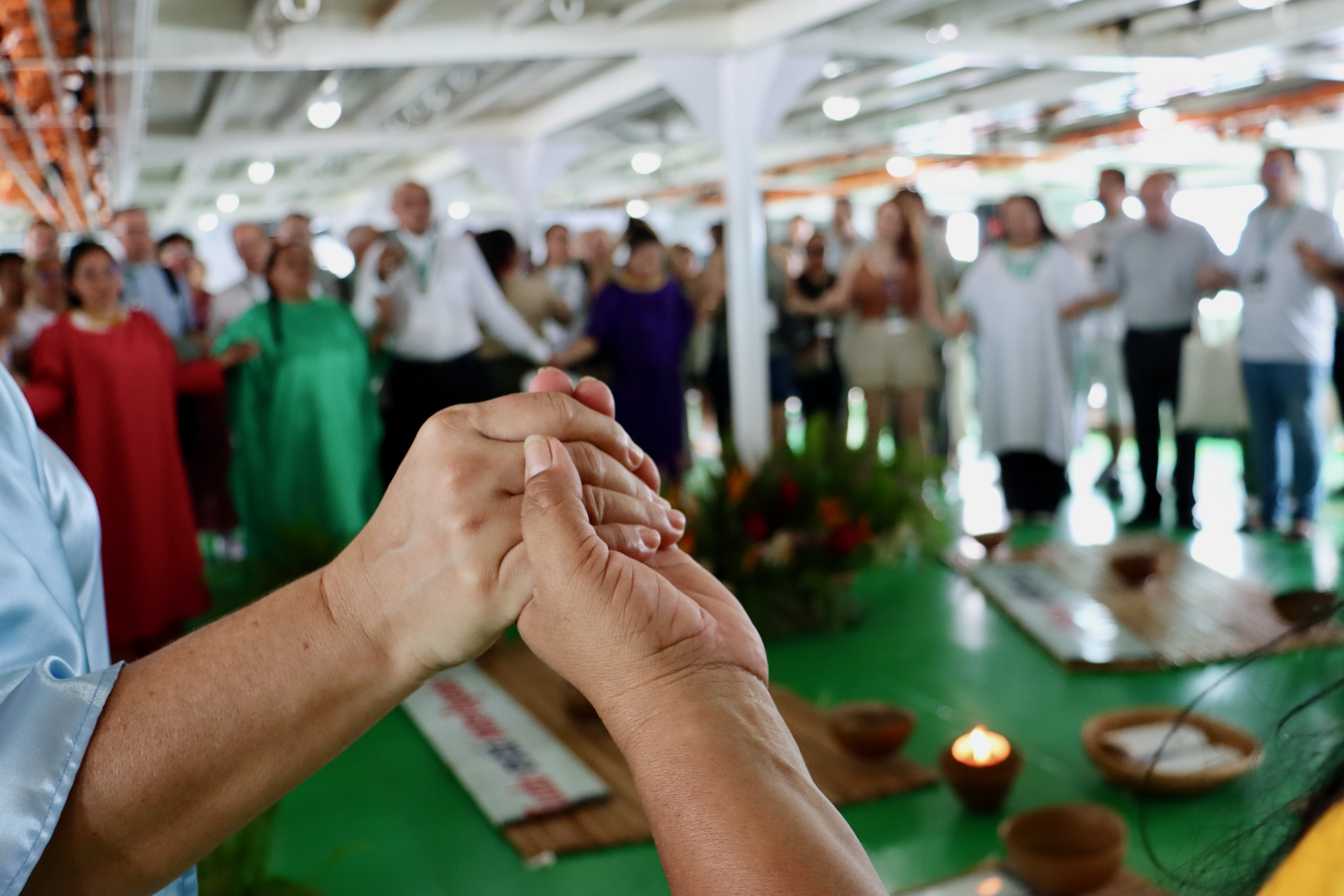 Então, houve a leitura do evangelho e uma breve orientação espiritual pelo cardeal arcebispo de Manaus, Dom Leonardo Steiner lembrou aos participantes que todos voltarão por caminhos diferentes, alguns pelas estradas, outros pelos rios, mas todos levarão a certeza da presença divina. “Tenhamos a certeza de que o Senhor nos acompanha, é Ele que nos acompanha mesmo quando achamos que Ele dorme”, afirmou. Para ele, assim como os amazônicos enfrentam o medo diante das águas agitadas, também os comunicadores e comunicadoras vivem suas próprias tempestades, especialmente diante das “intempéries” da sociedade atual. Mas reforçou com firmeza: “Ele não dorme, Ele está conosco”.